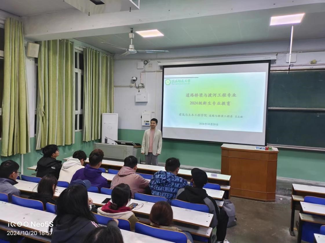 10月20日下午,道路与桥梁工程系在J2-T5教室举行了道路桥梁与渡河工程专业新生入学教育活动。道路与桥梁工程系负责人吴志强、系内部分教师代表及全体道路桥梁与渡河工程专业新生参加了活动。吴志强首先从国家交通强国战略出发,详细介绍了道路桥梁与渡河工程专业的发展现状和美好前景,鼓励新生坚定专业信心。随后,重点讲解了专业培养目标和课程体系,帮助新生更好地了解学业内容并做好学习规划。最后,教师代表们与新生就专业课程学习、继续深造、职业发展等问题进行了深入交流,并希望新生转变思想,变被动学习为主动学习,以崭新的积极姿态迎接大学生活,培养扎实的专业知识和实践能力,为将来成为优秀的道路桥梁与渡河工程师打下坚实基础。