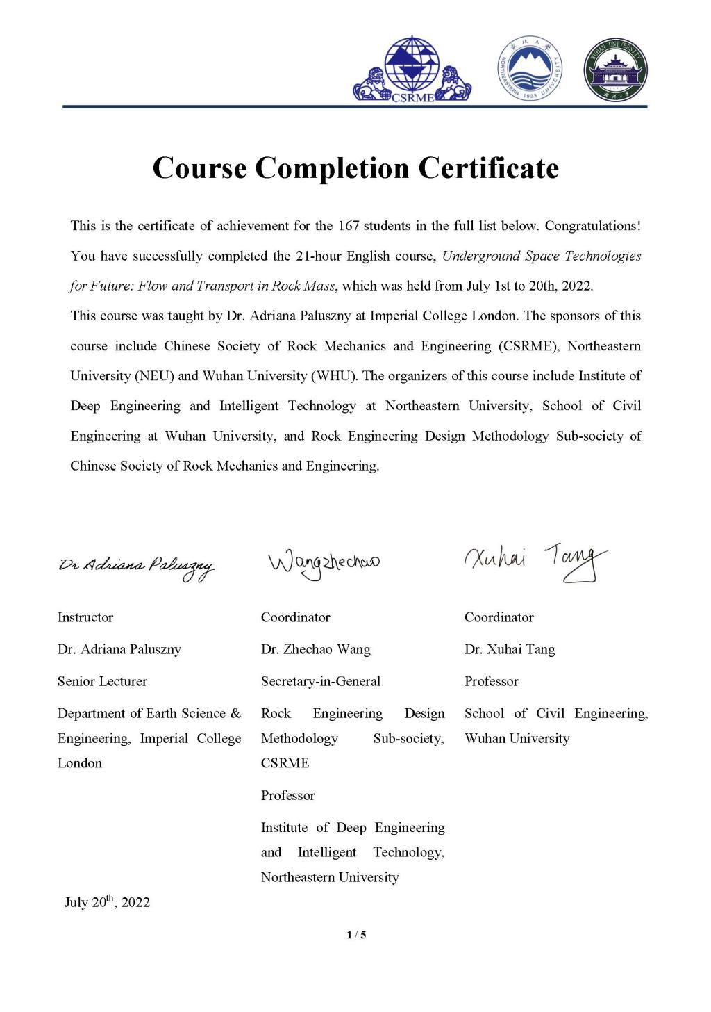 该课程由中国岩石力学与工程学会、东北大学和武汉大学联合主办,由东北大学深部工程与智能技术研究院、武汉大学土木建筑工程学院和中国岩石力学与工程学会岩石工程设计方法分会承办,由英国帝国理工学院高级讲师 Adriana Paluszny 博士主讲,由东北大学王者超教授、武汉大学唐旭海教授和东北大学李成博士组织,共21学时。