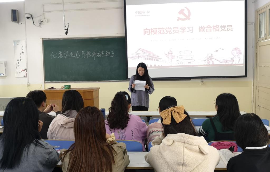 为进一步提高学生党员发展对象的政治素养和思想觉悟,发挥党员先锋模范作用,10月29日中午,我院在教三-11教室开展了优秀学生党员榜样示范教育活动。我院优秀学生党员贾臻、李梦茹及本期党员发展对象共同参加了此次活动。活动由本期党员发展对象组长李玲主持。