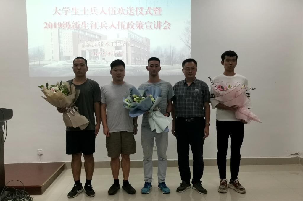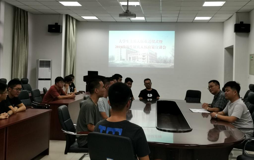 于9月8日下午召开了2019年大学生士兵入伍欢送仪式暨新生应征政策宣讲会。学院党委副书记方明科、武装干事张晓博、退役大学生代表凡洋洋、本次入伍大学生张萌阳、王玉杰、原中海以及部分入伍积极分子代表参加了本次会议。