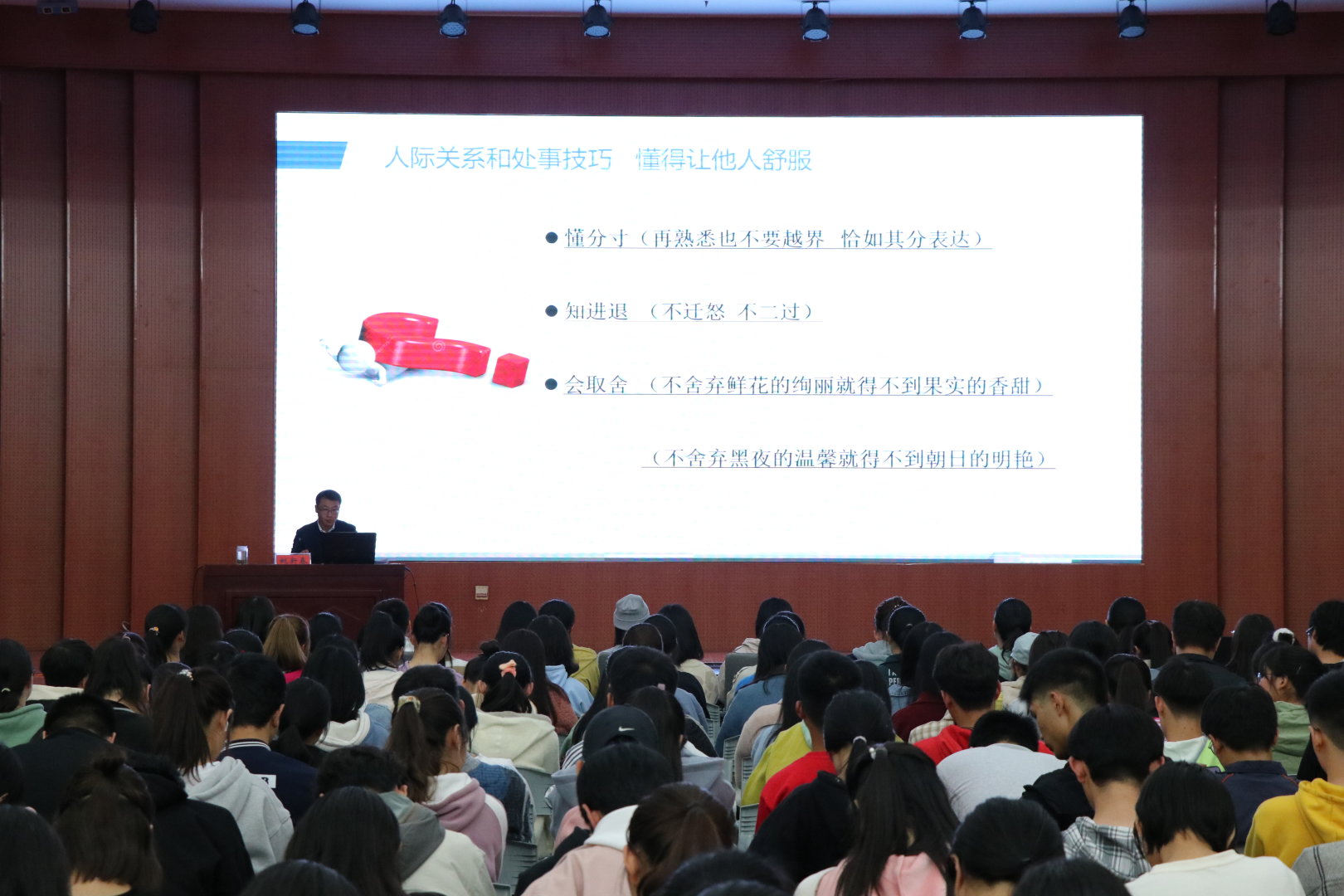 为了进一步贯彻落实校团委关于新生团校主题教育的精神要求,切实加强学院基层团支部建设,11月10日晚7点,我院联合生命科学学院共同邀请国际教育学院党委副书记姚新春在逸夫楼多功能报告厅为新生团员开展了题为《大学那些事》的主题教育报告会,学院党委副书记方明科、生命科学学院党委副书记杨霁虹等领导老师以及400余名团员代表参加了本次报告会。