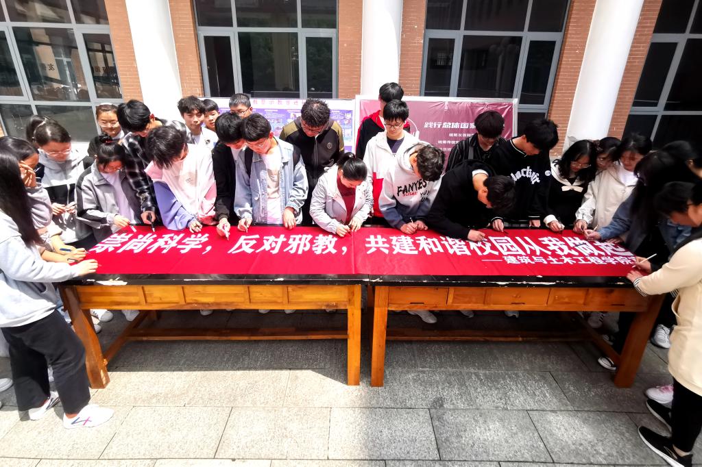 4月15日下午,学院在综合实验楼广场组织开展反邪教警示教育主题活动。活动上,同学们首先观看了《失陷的乐园》等主题教育短片,通过学习视频资料,同学们进一步认清了邪教的本质,从根本上、源头上预防了邪教的滋生,营造了和谐稳定的校园环境。接着,同学们来到综合实验楼小广场,在《反邪教警示教育进校园》主题展板前,学院团委书记张晓博为同学们讲解了大学生受邪教侵害案例,这些案例深深触动了同学们的内心,让他们从更深层次上了解到邪教组织对我们身心健康造成的伤害与影响,帮助他们提升了明辨是非的能力;了解了“法轮功”、“全能神”等邪教组织的本质与骗人的伎俩,树立起自觉抵制邪教渗透的防范意识。最后,同学们在“崇尚科学,反对邪教,共建和谐校园从我做起。”条幅上签下了自己的名字,坚定了做有理想、有信念的新时代大学生,努力把自己锻炼成为社会主义事业的建设者和接班人。(木瓜视频