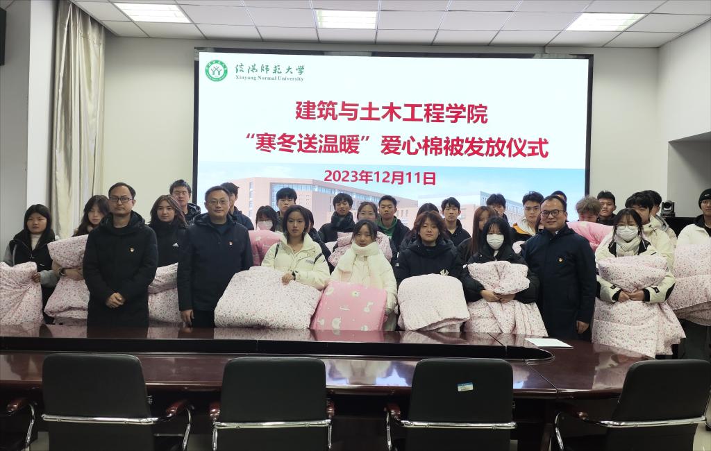 于2023年12月11日在综合实验楼206会议室举行“寒冬送温暖”爱心棉被发放仪式。学院党委书记方明科、副书记冀鹏、副院长袁晓辉以及受资助学生代表参加活动。