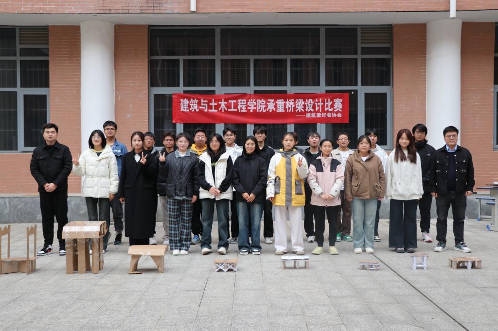 建筑爱好者协会在综合实验楼小广场举办承重桥梁设计大赛,学院团委负责人冯舒心,社团指导老师吕强、社团部分学生以及参赛选手参加活动。
