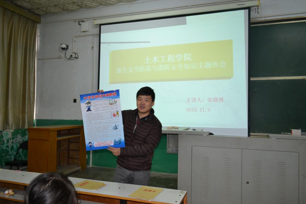 11月9日下午,学院专职辅导员张晓博为2016级新生召开了题为《新生安全防范与消防安全知识》的主题班会。主题班会从大学生宿舍防盗窃知识的介绍、消防安全“四个能力”的建设、大学生安全、消防防范相关法律法规等几个方面进行。班会主题鲜明,通过生动的现实案例使同学们深刻体会到消防安全的重要性。此外,还介绍了如何防诈骗、防盗窃、消除消防隐患、如何火场逃生、遇到火灾该如何处理等相关知识和技能。