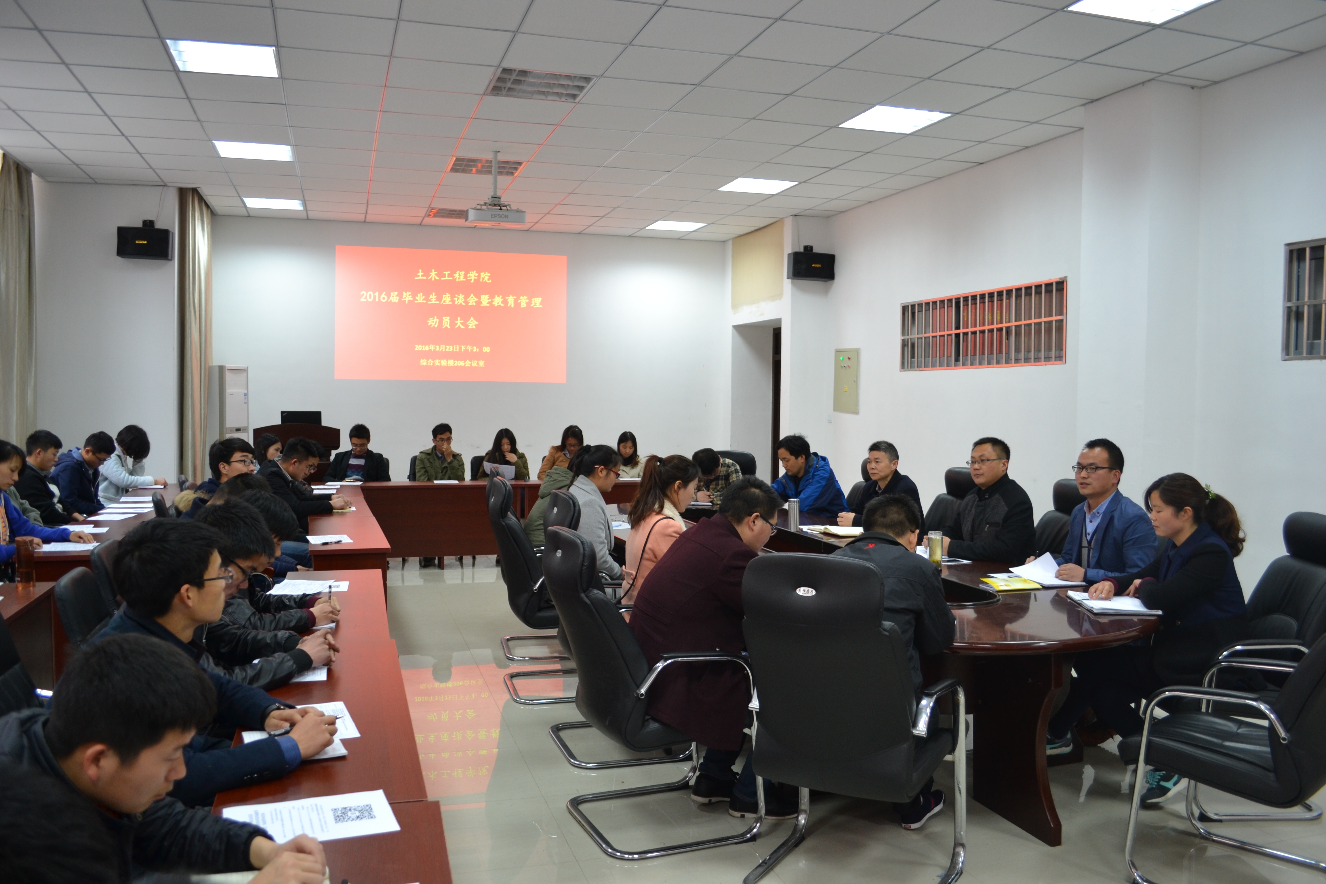 3月23日下午,土木工程学院在综合实验楼206会议室召开2016届毕业生座谈会暨教育管理动员大会。学院党委书记黄学玉、副书记方明科,教学办、团总支负责人及毕业班辅导员,与40余名毕业生代表一起参加了会议。
